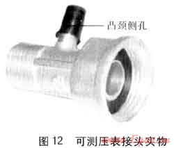 如圖12所示,可測(cè)壓表接頭是安裝于燃?xì)庥?jì)量表進(jìn)出口端的產(chǎn)品。在普通表接頭的基礎(chǔ)上研制出可測(cè)壓表接頭,可測(cè)壓表接頭上帶有一個(gè)具有凸頸的側(cè)孔,能夠方便地將測(cè)壓儀表通過(guò)凸頸安裝在表接頭上。通常情況下該側(cè)孔采用密封圈、螺釘及防護(hù)套堵住,保證管道密封性。當(dāng)需要測(cè)壓時(shí),去掉密封圈、螺釘及防護(hù)套,打開(kāi)側(cè)孔,安裝上測(cè)壓儀表即可測(cè)量壓力。測(cè)完之后,拆下測(cè)壓儀表,再采用密封圈、螺釘及防護(hù)套將側(cè)孔堵住,保證普通表接頭原有功能。
