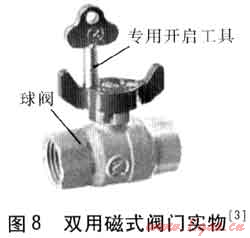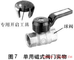 圖7閥門(mén)為可實(shí)現(xiàn)可關(guān)不可開(kāi)功能的單用磁式閥門(mén),閥門(mén)關(guān)閉后只能通過(guò)專(zhuān)用開(kāi)啟工具才能實(shí)現(xiàn)自由開(kāi)啟。該結(jié)構(gòu)關(guān)鍵技術(shù)在于閥體有扇形凸臺(tái),在扇形凸臺(tái)的軸向端和徑向端分別設(shè)置相垂直的兩個(gè)盲孔,手柄按閥體扇形凸臺(tái)徑向和軸向相垂直盲孔對(duì)應(yīng)位置分別開(kāi)設(shè)相對(duì)應(yīng)的盲孔。閥體扇形凸臺(tái)上軸向和徑向盲孔和手柄內(nèi)的磁銷(xiāo)、彈簧能準(zhǔn)確地按對(duì)應(yīng)預(yù)設(shè)盲孔插入,即可實(shí)現(xiàn)可關(guān)不可開(kāi)功能。當(dāng)閥門(mén)需要正常工作時(shí),只能通過(guò)專(zhuān)用開(kāi)啟工具內(nèi)的強(qiáng)磁與閥內(nèi)的磁銷(xiāo)通過(guò)磁場(chǎng)“同性相斥,異性相吸”的原理實(shí)現(xiàn)自由開(kāi)啟閥門(mén)。產(chǎn)品出廠時(shí)一般設(shè)置為開(kāi)啟狀態(tài)。