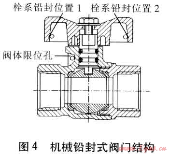 閥門(mén)的開(kāi)啟與關(guān)閉狀態(tài)均可設(shè)置為用栓系鉛封線(xiàn)控制閥的自由開(kāi)關(guān)狀態(tài)。該結(jié)構(gòu)的關(guān)鍵技術(shù)在于在閥體限位孔和兩個(gè)蝶翼手柄上設(shè)置栓系鉛封線(xiàn)孔。當(dāng)閥需要在開(kāi)啟狀態(tài)處于開(kāi)啟不可關(guān)時(shí),只需將蝶形手柄蝶翼栓系鉛封位置1上的孔與閥體限位孔進(jìn)行鉛封線(xiàn)栓系,即可實(shí)現(xiàn);閥需要在關(guān)閉狀態(tài)處于關(guān)閉不可開(kāi)功能時(shí)只需將蝶形手柄蝶翼栓系鉛封位置1或2上的孔與閥體限位孔進(jìn)行鉛封線(xiàn)栓系,即可實(shí)現(xiàn);若需實(shí)現(xiàn)閥開(kāi)啟與關(guān)閉狀態(tài)均可自由開(kāi)關(guān),只需閥體限位孔和手柄蝶翼的鉛封線(xiàn)不進(jìn)行栓系,即可實(shí)現(xiàn)普通閥門(mén)自由開(kāi)關(guān)功能。閥門(mén)出廠時(shí)一般設(shè)置為自由開(kāi)關(guān)狀態(tài)。