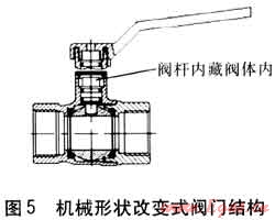 圖1、2所示閥門(mén),在普通燃?xì)忾y門(mén)的基礎(chǔ)上改變控制閥門(mén)開(kāi)關(guān)手柄結(jié)構(gòu)。該結(jié)構(gòu)關(guān)鍵技術(shù)在于手柄下端分別設(shè)有一扇形凹槽和方形凹槽。當(dāng)閥體上凸臺(tái)與手柄上方形凹槽配合時(shí),手柄與閥體互相限位不能轉(zhuǎn)動(dòng),實(shí)現(xiàn)關(guān)閉不可開(kāi)的功能,手柄與閥桿通過(guò)非標(biāo)螺母連接固定,使用專(zhuān)用工具操作。當(dāng)閥體上凸臺(tái)與手柄上扇形凹槽配合時(shí),手柄可在90°范圍內(nèi)旋轉(zhuǎn)定位,自由控制球閥開(kāi)關(guān),即可實(shí)現(xiàn)普通閥門(mén)功能。例如用戶(hù)未及時(shí)繳費(fèi)或出現(xiàn)用氣異常等情況,均可設(shè)置閥門(mén)手柄為關(guān)閉不可開(kāi)狀態(tài);用戶(hù)用氣正常等情況,可設(shè)置閥門(mén)手柄為自由開(kāi)關(guān)的狀態(tài)。產(chǎn)品出廠時(shí)一般設(shè)置為可自由開(kāi)關(guān)狀態(tài),用戶(hù)和燃?xì)夤?yīng)企業(yè)根據(jù)需求可自行設(shè)置功能。
