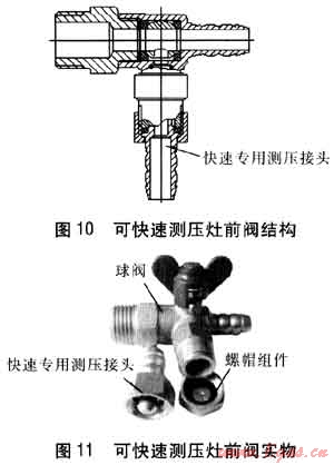 圖10、11所示閥門(mén)為可實(shí)現(xiàn)不用關(guān)閉或切斷管道燃?xì)獾那闆r下進(jìn)行快速測(cè)壓的燃?xì)忾y門(mén)。不要測(cè)壓時(shí),灶前閥處于開(kāi)啟狀態(tài),測(cè)壓裝置處于常自閉狀態(tài),即密封狀態(tài)。需要測(cè)壓時(shí),只需逆時(shí)針擰下螺帽組件,將快速專(zhuān)用測(cè)壓接頭連接到測(cè)壓接口,使快速專(zhuān)用測(cè)壓接頭接觸預(yù)設(shè)測(cè)壓工作區(qū)域,并逐步順時(shí)針擰緊,推動(dòng)閥芯壓縮彈簧向內(nèi)移動(dòng),使測(cè)壓接口內(nèi)的密封口脫離密封臨界設(shè)置同時(shí)達(dá)到無(wú)外泄漏,從而使燃?xì)忭樌鲃?dòng)。當(dāng)測(cè)壓完畢后,將快速專(zhuān)用測(cè)壓接頭逆時(shí)針擰出測(cè)壓接口,密封墊在彈簧的作用下迅速歸位,達(dá)到無(wú)泄漏狀態(tài),擰緊螺帽組件進(jìn)行保險(xiǎn)密封,可以實(shí)現(xiàn)快速、安全地進(jìn)行測(cè)壓作業(yè)。該產(chǎn)品公稱(chēng)壓力不大于1.6MPa,工作溫度為-20~120℃。