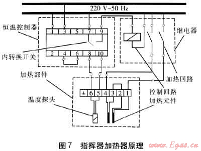指揮器加熱器結構簡單,主要由加熱部件(見圖6)、恒溫控制器和繼電器三部分組成,其中恒溫控制器和繼電器只能安裝在非防爆區(qū)域,通過導線對加熱部件進行連接,加熱部件則通過配件安裝在調壓器指揮器上游信號管上,通過加熱部件中的加熱元件對指揮器信號管內的燃氣進行加熱。指揮器加熱器是通過不同的元器件的綜合作用達到自動控制加熱的目的,原理見圖7,圖中的數(shù)字1~10為開關接線端子編號,接線時按圖7要求,其中2、5端子為備用。設: