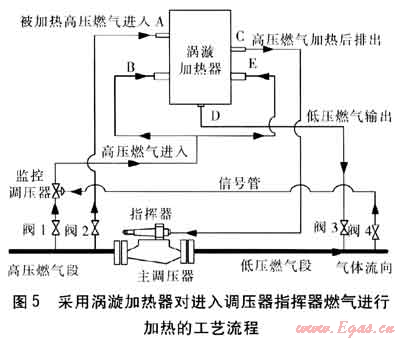 采用渦漩加熱器對進入調壓器指揮器燃氣進行加熱的工藝流程見圖5。