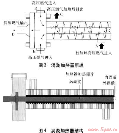 高壓燃氣通過渦漩先導燃氣加熱器(以下簡稱渦漩加熱器)時,渦漩加熱器將燃氣減壓產生的能量轉化成高溫熱氣流,然后利用高溫熱氣流對調壓器指揮器進行加熱。