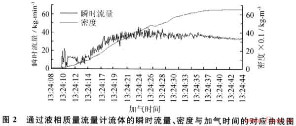 從圖2中可以看到加氣機(jī)從加氣開(kāi)始,瞬時(shí)流量快速波動(dòng)上升,而密度以一定斜率緩慢上升。從13:24:10開(kāi)始加氣到13:24:35密度趨于穩(wěn)定,約有20s時(shí)間流量計(jì)流過(guò)的介質(zhì)處于氣液兩相流狀態(tài)。加氣機(jī)通過(guò)控制控制閥1和控制閥2的動(dòng)作順序可以有效避免由于測(cè)量介質(zhì)存在氣液兩相而造成的計(jì)量不準(zhǔn)問(wèn)題,具體工作原理為:當(dāng)加氣機(jī)開(kāi)始加氣時(shí),控制閥1關(guān)閉,控制閥2打開(kāi),此時(shí)流量計(jì)測(cè)量流體狀態(tài),但不參與計(jì)量;當(dāng)流體狀態(tài)達(dá)到測(cè)量要求時(shí),控制閥2關(guān)閉,同時(shí)打開(kāi)控制閥1,測(cè)試流量計(jì)開(kāi)始計(jì)量,完成加注任務(wù)。