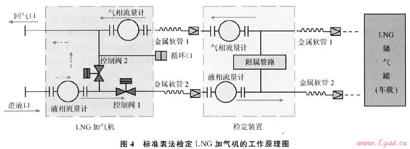 考慮到稱(chēng)重法的弱點(diǎn),現(xiàn)場(chǎng)檢定LNG加氣機(jī)優(yōu)先選用標(biāo)準(zhǔn)表法。根據(jù)實(shí)際操作過(guò)程,標(biāo)準(zhǔn)表法又可進(jìn)一步分為啟停法和動(dòng)態(tài)法。標(biāo)準(zhǔn)表法檢定LNG加氣機(jī)的工作原理圖如圖4所示。