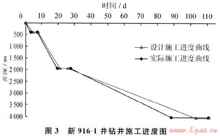 從本井時效分析結(jié)果可知,全井鉆井總臺時為2121.5h,臺月效率為1366.10m/臺月,高于設(shè)計值15.94%;純鉆率為57.31%,高于沒計值15.26%;全井平均鉆速為3.31m/h,高于設(shè)計值0.61%。事故率為0,鉆井周期為88.4d,平均機械鉆速為3.31m/h,實現(xiàn)了以須四段為目的層的4000m定向深井105d完鉆的提速奮斗目標(biāo),并較提速目標(biāo)提前16.60d,創(chuàng)造了川西地區(qū)4000m定向深井鉆井周期最短紀(jì)錄(施工進(jìn)度如圖3所示)。