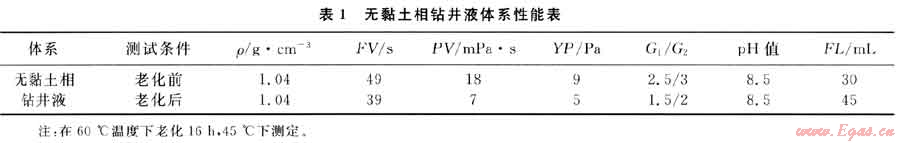 通過對元黏土相鉆井液的抑制封堵性能和抗溫性能實驗評價,在鉆井液中加入快速成膜劑和低熒光封堵防塌劑后更易于抑制井壁的水化分散和膨脹。形成的無黏土相鉆井液體系,性能如表1所示。從表1可以看出,無黏土相鉆井液具有密度低、動塑比高、失水大等特點。