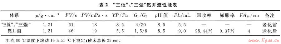 結(jié)合川西地區(qū)沙溪廟組到須五段的地層特點,在液體欠平衡方面,研究了“三低”(低密度、低黏切、低固相)聚合物鉆井液和“三強”(強抑制、強包被、強封堵)聚合物鉆井液。“三低”、“三強”鉆井液性能如表2所示。