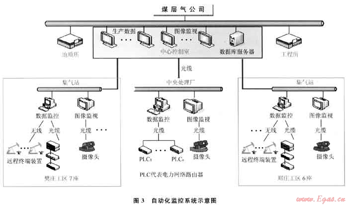 采用SCADA系統(tǒng)對(duì)全區(qū)生產(chǎn)運(yùn)行分單井-集氣站-處理中心3級(jí)監(jiān)控和運(yùn)營管理(圖3),集氣站采用以計(jì)算機(jī)控制技術(shù)為核心的站控系統(tǒng)(SCS),完成站場(chǎng)內(nèi)工藝過程的數(shù)據(jù)采集和監(jiān)控任務(wù),采氣井場(chǎng)設(shè)置SCADA系統(tǒng)遠(yuǎn)程終端裝置(RTU),將井口數(shù)據(jù)通過無線寬帶+光纜傳輸?shù)姆绞絺髦翑?shù)據(jù)中心。實(shí)現(xiàn)了生產(chǎn)管理的智能化,減少了30%的用工總量,保障了系統(tǒng)平穩(wěn)運(yùn)行,提高了管理水平和工作效率。