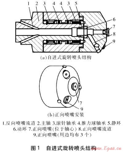 自進式旋轉(zhuǎn)射流解堵工藝的關(guān)鍵設(shè)備為自進式旋轉(zhuǎn)噴頭,其結(jié)構(gòu)見圖1。