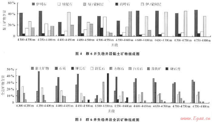 由圖5可以看出,群6井失穩(wěn)井段的全巖礦物以石英(相對含量介于11%~47%)、黏土礦物(相對含量介于6%~37%)、斜長石(相對含量介于6%~24%)、方解石(相對含量介于1%~17%)、白云石(相對含量介于3%~31%)為主,還含少量的鉀長石、石膏和黃鐵礦,缺失方沸石、菱鐵礦和鹽巖。同時處于4500~4550m井段的地層硬石膏相對含量較高,達到了44%,屬石膏泥巖層,當鉆井過程中鉆遇到該地層時,鉆井液液柱壓力不能平衡地層坍塌壓力,地層在地層坍塌壓力作用下向井眼擠壓,或者鉆井液中抗鹽抗鈣處理劑加量不足,使石膏吸水膨脹、分散,從而造成井下坍塌、掉塊、卡鉆等鉆井復(fù)雜事件。