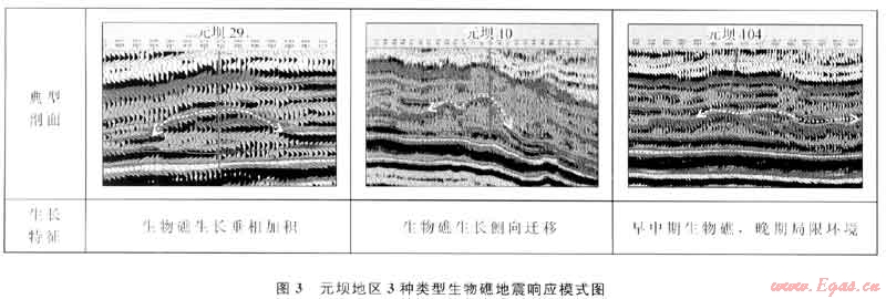 通過對元壩地區(qū)鉆錄井和三維地震資料的綜合分析,依據(jù)生物礁特征劃分提出了3種類型的生物礁:垂向加積生物礁、側(cè)向遷移生物礁及早期生物礁(圖3),3種生物礁的生長與儲層發(fā)育均具有顯著特點。在該認識的指導下,提高了生物礁描述及井位優(yōu)選精度,保證了勘探部署井的高成功率。