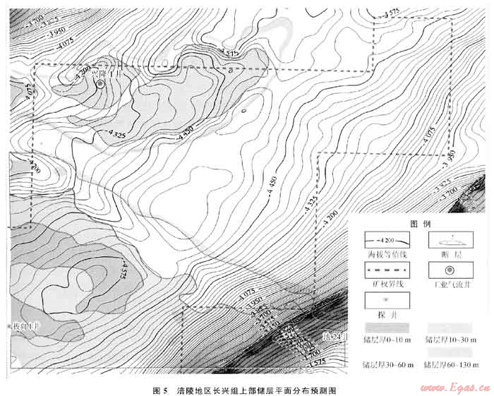 隨著元壩氣田勘探的突破,加強了對該區(qū)長興組-飛仙關(guān)組的油氣評價研究,通過大量基礎性工作,落實涪陵北部長興組-飛仙關(guān)組發(fā)育臺緣相沉積,評價結(jié)果認為:涪陵復向斜區(qū)具備巖性圈閉成藏條件,進而建立起二疊系礁灘相“近源聚集、巖性控藏、晚期調(diào)整”的成藏新認識。在上述新認識的基礎上,提出主攻復向斜區(qū)二疊系、三疊系臺緣礁灘相帶巖性圈閉的勘探新思路。2009年部署在涪陵北部巖性圈閉上的興隆1井在長興組鉆遇臺地邊緣礁灘相儲層,長興組測試獲51.7×104m3/d的工業(yè)氣流,取得了復向斜區(qū)勘探的突破(圖5),目前正在展開礁灘相目標的評價工作。