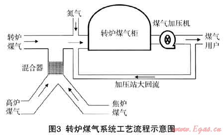 (2) 利用轉爐煤氣柜、煤氣加壓站、合成轉氣混合站等設施,在實際生產(chǎn)過程中町以實現(xiàn)焦爐煤氣和氮氣之間的定量、均勻混合,合成后的混合氣可以通過加壓站供給用戶使用。