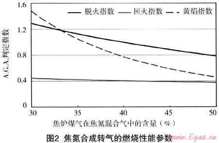 根據(jù)美國燃氣協(xié)會A.G.A.36#公告中公布的關于燃氣互換性預測的方法[2~4],利用“I”指數(shù)法,對焦氮混合氣替代高焦合成轉氣時的脫火指數(shù)、回火指數(shù)和黃焰指數(shù)進行了計算,其結果如圖2所示。