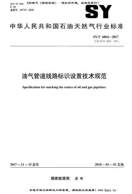 油氣管道線路標(biāo)識(shí)設(shè)置技術(shù)規(guī)范SY/T 6064-2017 :本標(biāo)準(zhǔn)代替SY/T 6064 2011 《管道干線標(biāo)記設(shè)置技術(shù)規(guī)范》,與SY/T 6064- 2011 相比,除編輯性修改外,主要技術(shù)變化如下: