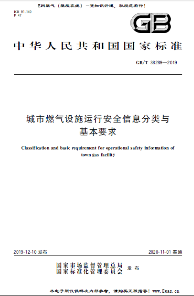 城市燃?xì)庠O(shè)施運(yùn)行安全信息分類(lèi)與基本要求GB∕T 38289-2019 本標(biāo)準(zhǔn)規(guī)定了城市燃?xì)庠O(shè)施運(yùn)行安全信息的術(shù)語(yǔ)和定義.基本原則,分類(lèi)和基本要求。