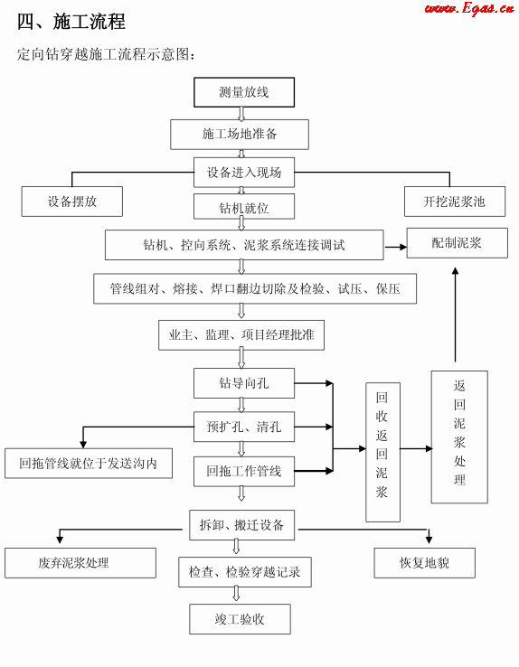 **河水面寬度約***m,采用水平定向鉆穿越1孔中100mm導(dǎo)向孔,擴(kuò)孔至500mm導(dǎo)向孔,然后清孔一次,回拉已試壓完成的DeXX燃?xì)夤艿?,穿越長度約180m,擬采用ZT-18型水平鉆機(jī)進(jìn)行施工,預(yù)計(jì)施工***天。