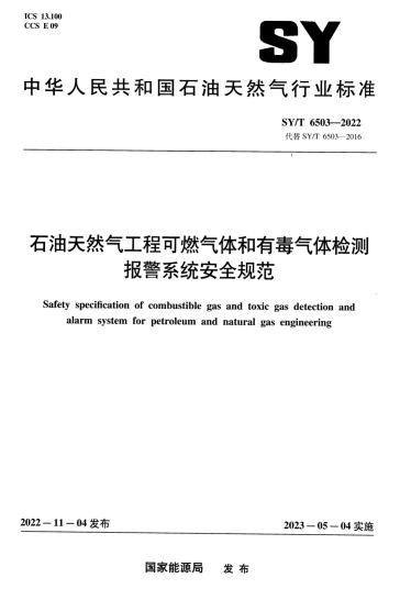 石油天然氣工程可燃?xì)怏w和有毒氣體檢測(cè)報(bào)警系統(tǒng)安全規(guī)范SY/T 6503-2022:本文件規(guī)定了石油天然氣工程中可燃?xì)怏w和有毒氣體檢測(cè)點(diǎn)的確定,探測(cè)器、報(bào)警控制單元和現(xiàn)場(chǎng)警報(bào)器的選用、安裝、檢查、維護(hù)、檢定及報(bào)廢等基本要求。